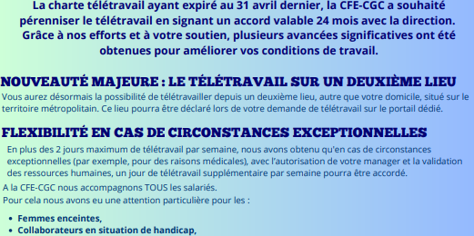 Nous avons le plaisir de vous annoncer que la CFE-CGC a signé l’accord télétravail ! La charte télétravail ayant expiré au 31 avril dernier, la CFE-CGC a souhaité pérenniser le télétravail en signant un accord valable 24 mois avec la direction.