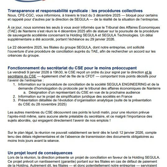 Transparence et responsabilité syndicale : les procédures collectives. Nous, CFE-CGC, vous informions, à travers le tract du 3 décembre 2025 — bloqué pour certains et rappelé pour d’autres par la direction de SEGULA — de la réalité de la situation de l’entreprise.