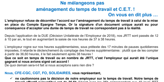 L’employeur refuse de décorréler l’accord sur l’aménagement du temps de travail à celui de la mise en place du Compte Epargne Temps. Or la signature d’un document unique aurait eu pour conséquence d’accepter une durée de temps de travail ne correspondant pas à la réalité.