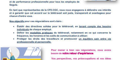 La CFE-CGC, a le plaisir de vous annoncer le lancement de concernant le télétravail au sein de notre entreprise Cet accord remplacera la charte télétravail actuellement en vigueur jusqu’à la fin du mois d’avril.